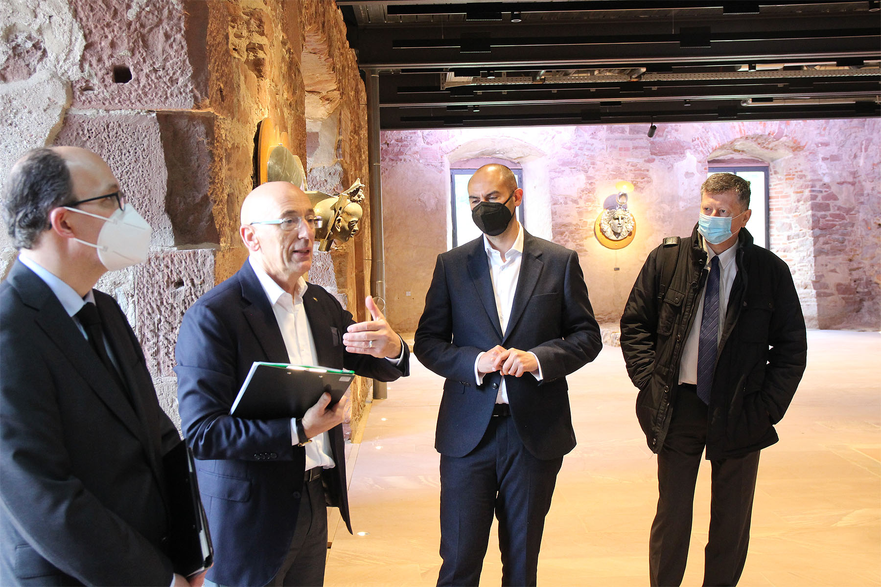Michael Hörrmann, Geschäftsführer der SSG, vorn, erläutert Finanzminister Dr. Bayaz wesentliche Aspekte des Schlosses in Denkmalpflege und Vermarktung. Foto: kulturer.be
