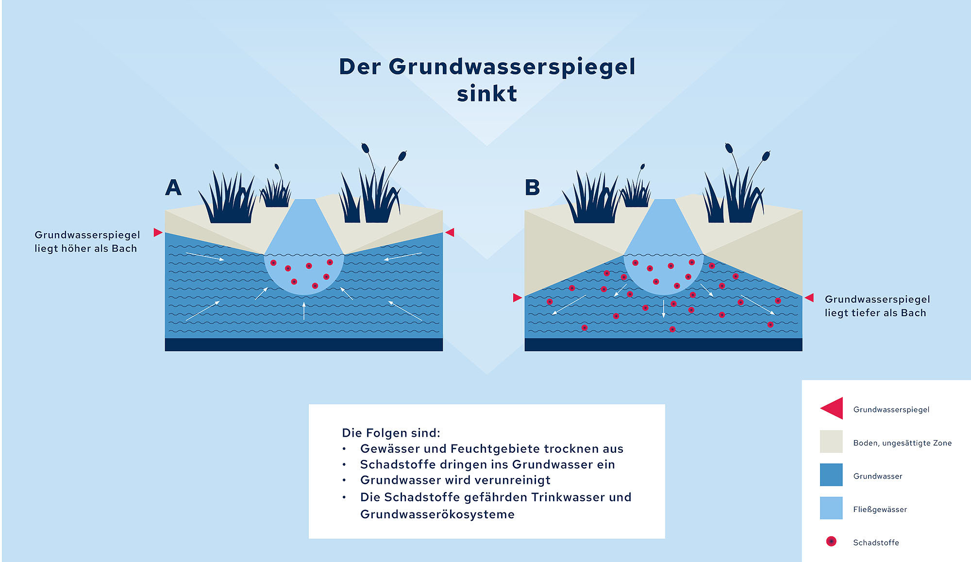 Als Folge des Klimawandels kippt vielerorts der Landschaftswasserhaushalt: Durch sinkende Grundwasserstände versickern die Fließgewässer in den Untergrund und verschmutzen mit ihren Schadstoffen das Grundwasser. Grafik: Sina Hurnik
