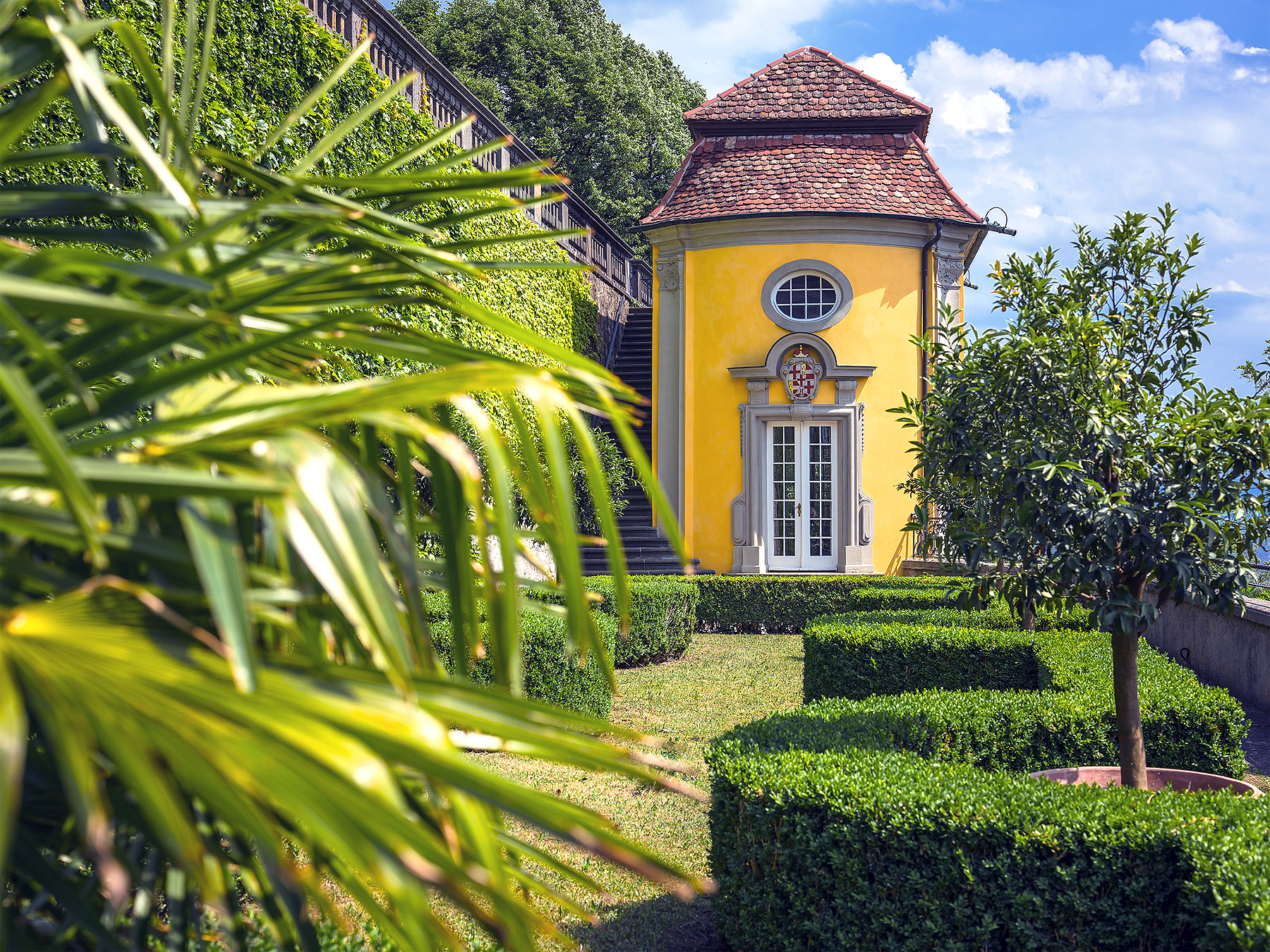 Der kleine gelbe Pavillon schmiegt sich eng an die Mauern, die das prächtige Barockschloss von Meersburg stützen. Vom Schloss aus ist vom Teehäuschen nur das Dach mit den leicht nach außen geschwungenen Spitzen zu sehen. Es ist der perfekte Rückzugsort hoch über dem Bodensee! Die ehemalige Residenz der Fürstbischöfe von Konstanz mit ihrem monumentalen Treppenhaus, entworfen vom barocken Stararchitekten Balthasar Neumann, diente dazu, Reichtum und Macht der Kirchenfürsten auszustellen. Das Teehäuschen dagegen war ein verborgener Ort gemütlicher Plaudereien.