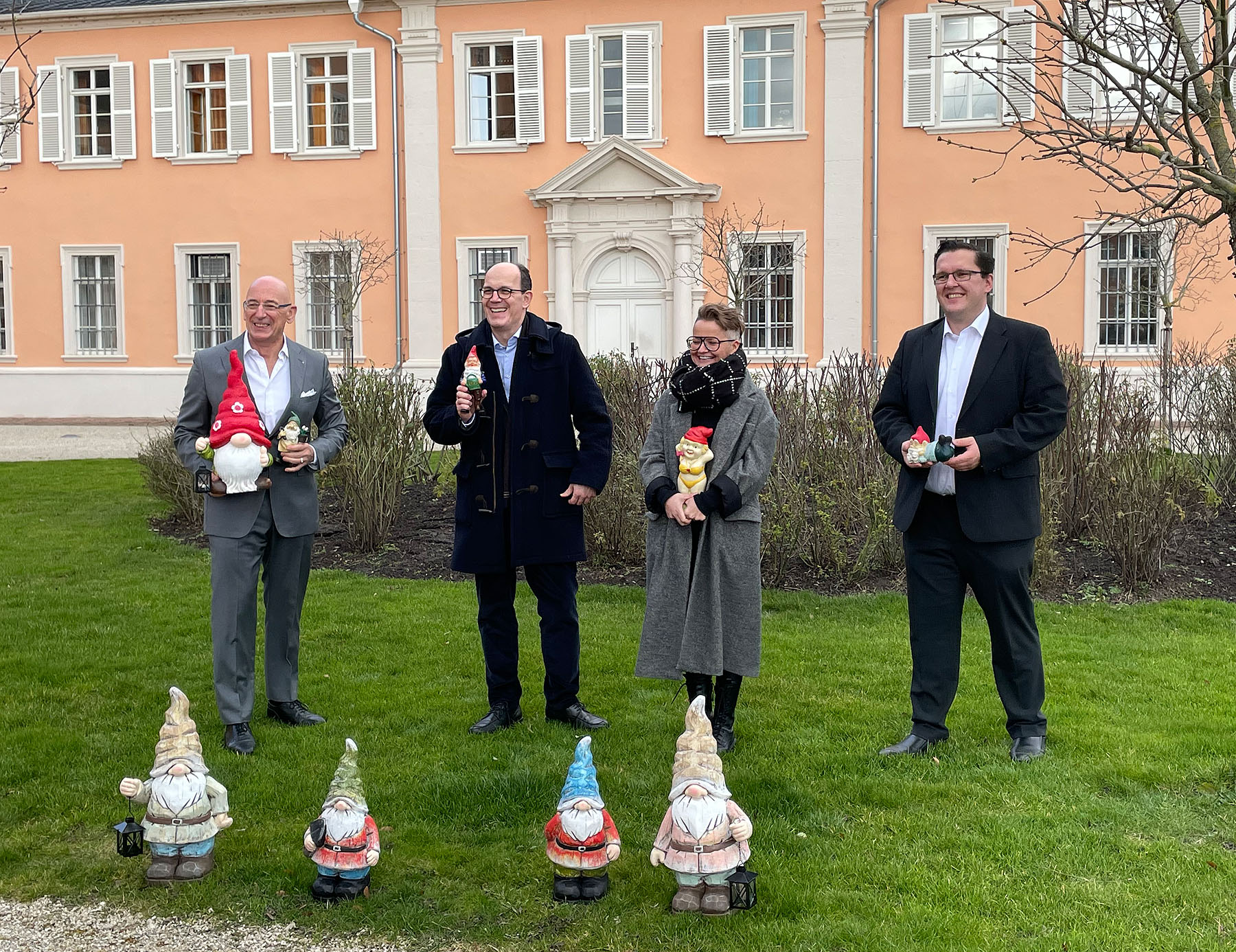 Die Vorgabe: Gartenzwerge aus dem Bestand. Ganz unten Michael Hörrmann, Frank Krawczyk (beide SSG), Sandra Moritz (Schloss Schwetzingen) und Manuel Liehr SSG) bei der Vorstellung des Projekts.