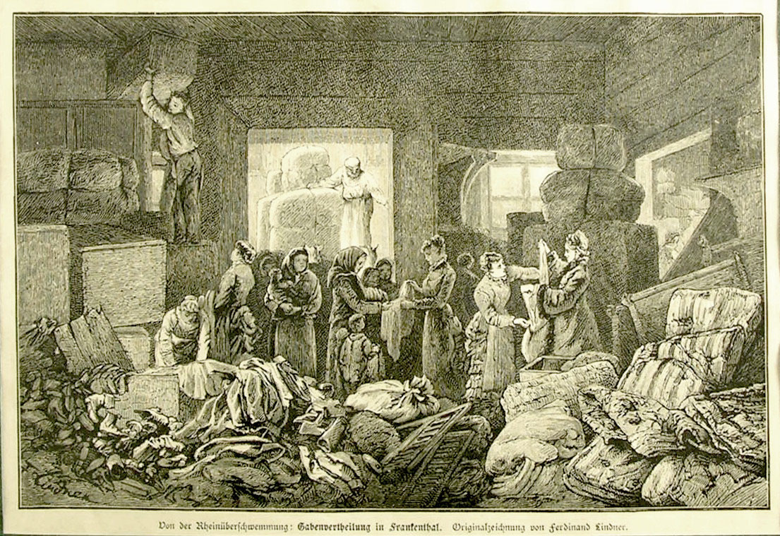 Die Reproduktion der zeitgenössischen Druckgrafik einer Zeichnung Ferdinand Lindners stammt aus dem Jahr 1883. „Von der Rheinüberschwemmung: Die Gabenvertheilung in Frankenthal“ betitelt in Fraktur die Zeichnung des Landschafts- und Marinemalers im Format 15 x 23 cm. Das Motiv hat einen ebenso ernsten wie mutmachenden Hintergrund.