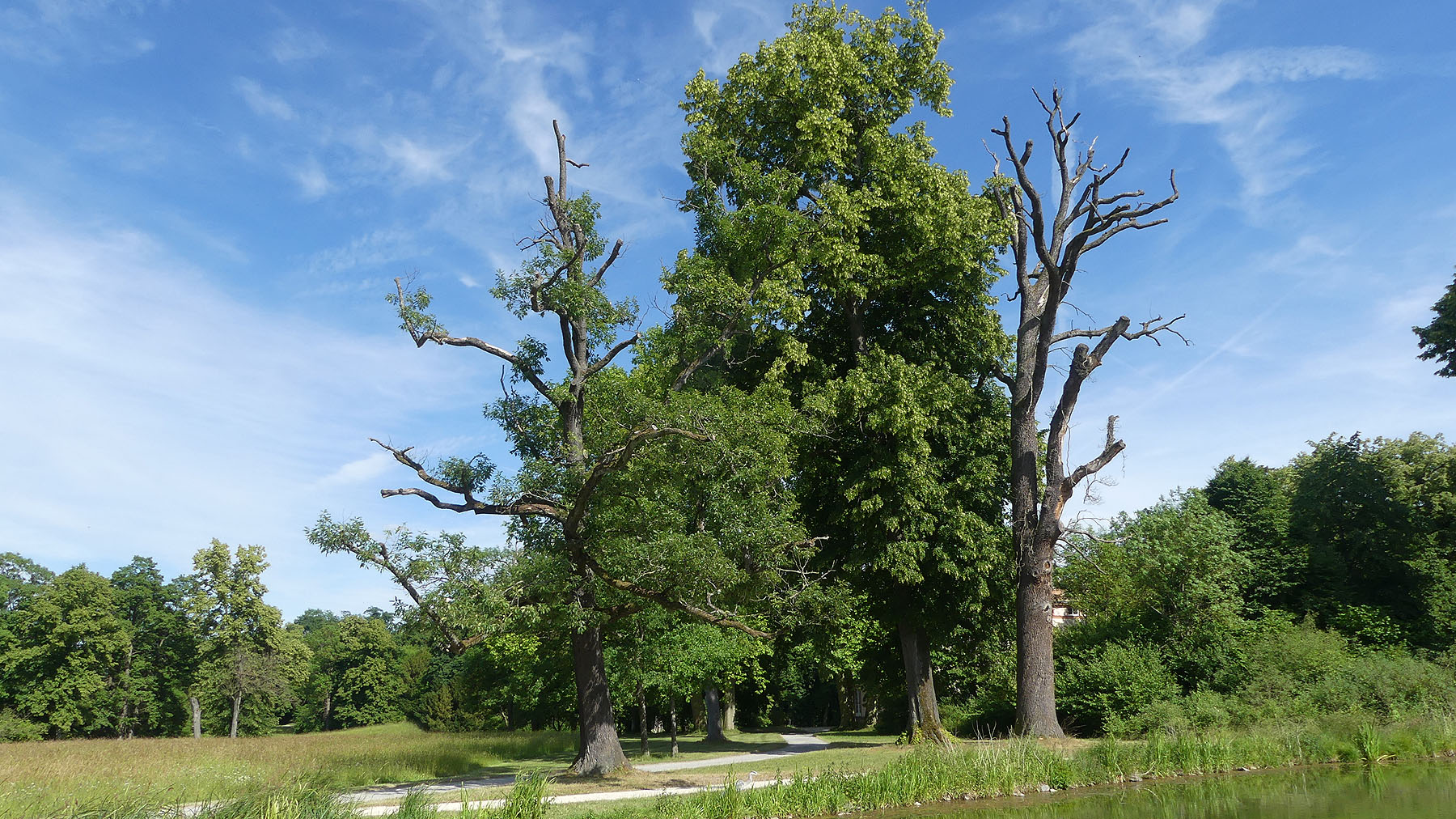Stark geschädigte bzw. bereits abgestorbene alte Stieleichen (Quercus robur L.) am Oberen See im Park Schönbusch (Aschaffenburg), an denen Dürreperioden der vergangenen Jahre schwere Schäden verursacht haben.