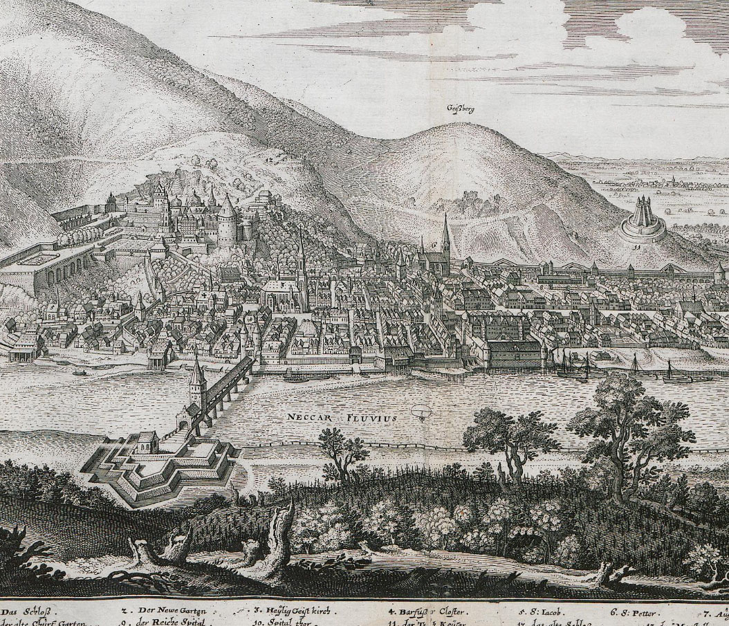 Matthäus Merian, Ansicht von Heidelberg vom Hang des gegenüberliegenden Berges aus. Topographia Palatinatus, UB Heidelberg.