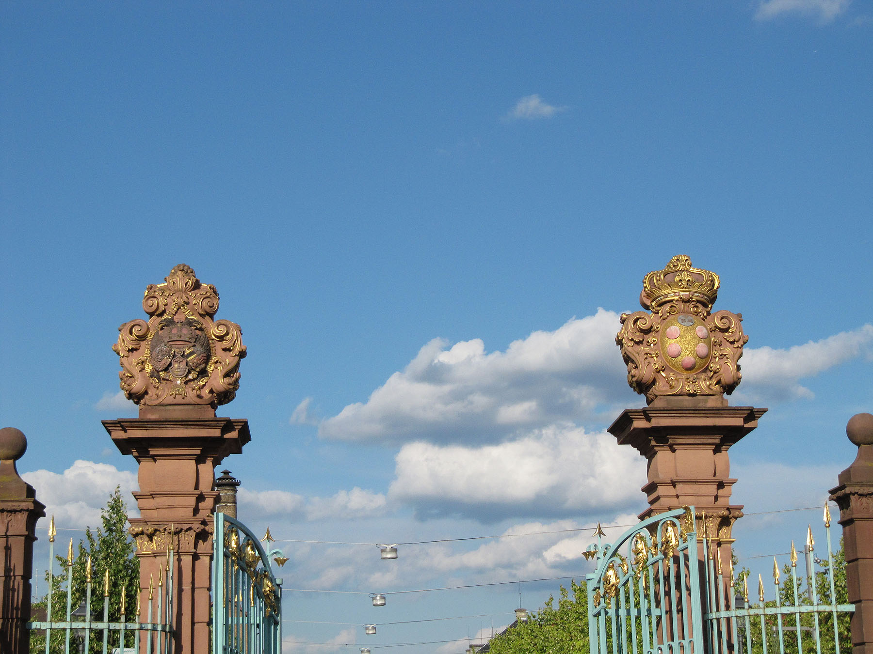 Wappen des Kurfürsten Johann Wilhelm und seiner Gemahlin Anna Maria Luisa de' Medici am Eingang zum Schwetzinger Schlossbezirk. Foto: kulturer.be