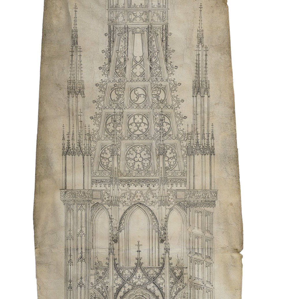 Johannes Hültz:’ Straßburger Münster, ursprünglicher Entwurf des TurmhelmsTurmspitze und Plattformgeschoss. Foto: Musee de l'Oeuvre Notre Dame