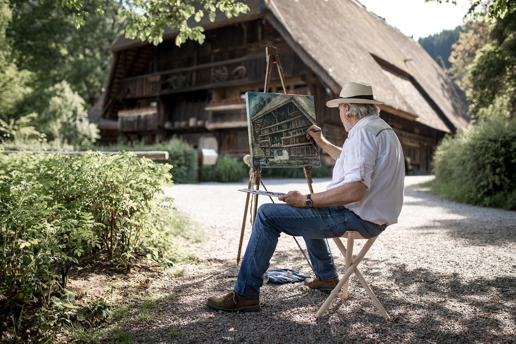 Der erfahrene Kunstmaler Wolfram Paul aus Altensteig (Bild links, Foto: Schwarzwälder Freilichtmuseum Vogtsbauernhof, Iuliu Sebastian Wagner) nimmt am Samstag, den 12. August, in die Welt der Freilichtmalerei mit. Die Teilnehmer erlernen von 13 bis 17 Uhr die Grundzüge der traditionellen Landschaftsmalerei und beginnen ihr eigenes Werk unter Inspiration der bekanntesten Schwarzwaldmaler in Gutach: Wilhelm Hasemann und Curt Liebich.