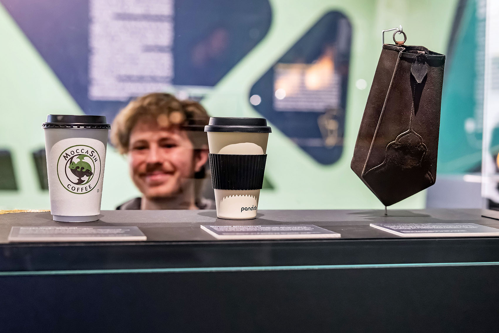 Besonders imposant und ein Beispiel für die Wertschätzung von Dingen ist eine antike Preisamphore aus Griechenland: Vor über 2.500 Jahren wurde sie als Siegpreis an Wettkämpfer vergeben. Obwohl sie stark beschädigt war, entschieden sich die Menschen damals, die Amphore mit aufwendigen Techniken zu reparieren, statt sie wegzuwerfen. Kleine Löcher und bleierne Nieten halten die Bruchstücke zusammen und ermöglichen es dem Objekt, die Jahrtausende zu überdauern. Ein weiteres Beispiel für den kreativen Umgang mit vermeintlichem Müll ist eine moderne Tasse aus recyceltem Kaffeesatz. Sie ist nicht nur besonders wärmeisolierend und fühlt sich durch ihre natürliche Oberfläche angenehm in der Hand an, sondern erzählt auch eine spannende Geschichte, die Gesprächsstoff bietet. Gleichzeitig steht sie für innovative Ansätze im nachhaltigen Design und zeigt, wie alltägliche Abfälle in nützliche und langlebige Produkte verwandelt werden können. Die in der Ausstellung gezeigten Objekte verdeutlichen, dass nachhaltiges Denken und Handeln nicht unbedingt eine moderne Erfindung sind, sondern über viele Epochen und Kulturen hinweg eine zentrale Rolle gespielt haben.