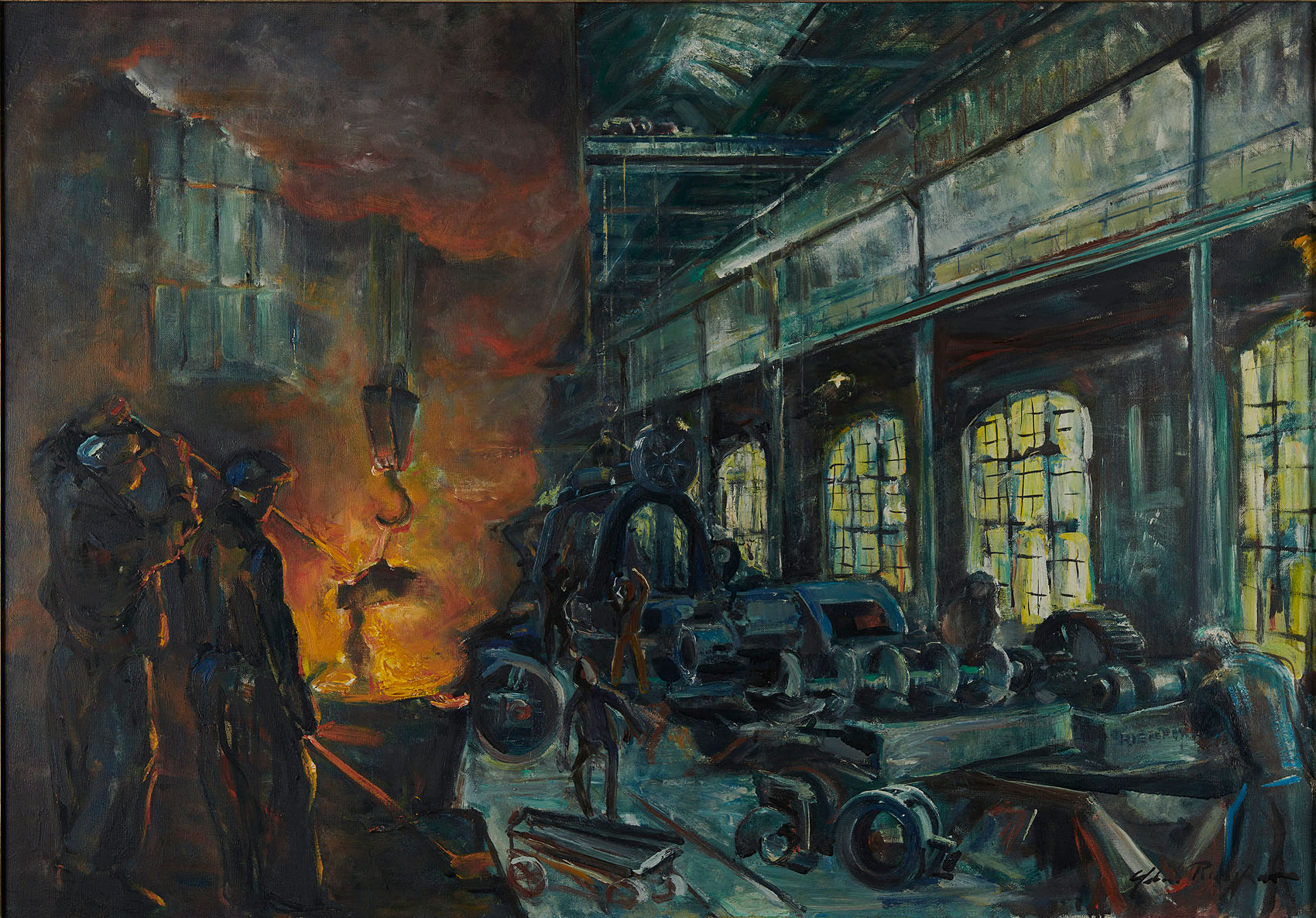 In der Nachfolge des großen Adolf von Menzel wirft die Künstlerin einen Blick in die große Werkshalle. Der Schein des flüssigen Metalls beleuchtet die Arbeiter in der Gießerei der 1874 gegründeten Rieter-Werke.