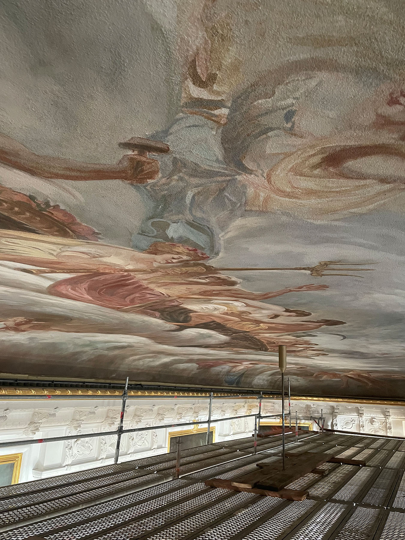 Schloss Mannheim, Rittersaal. Auf dem Gerüst: Arbeitsplattform und Geckengemälde. Foto: kulturer.be