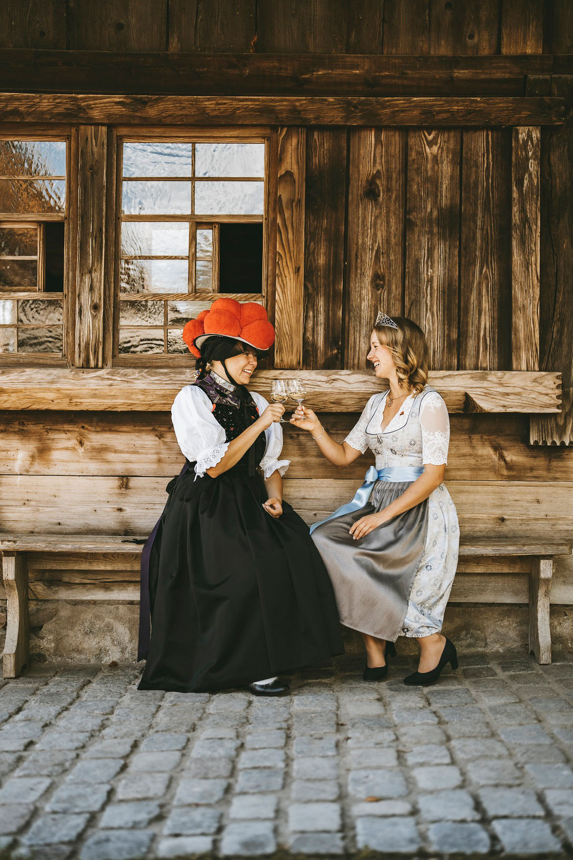 Vor einem der Häuser des Volgtsbauernhofs prosten sich zwei Frauen in Tracht zu. Foto: Weinparadies Ortenau e.V.