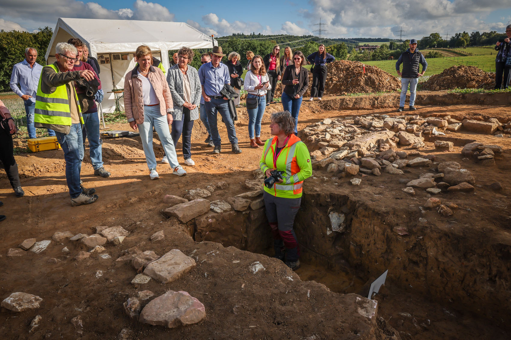 Ministerin Nicole Razavi MdL informiert sich an der Grabungsstelle über die frühmittelalterliche Befestigungsanlage „Birk“ in Seckach-Großeicholzheim