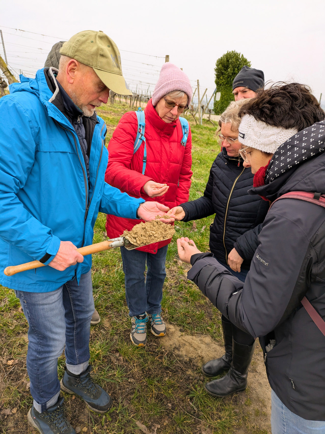 Bei zahlreichen Exkursionen, wie hier auf einem Weinberg im Markgräflerland, lernen die Gästeführerinnen udn Gästeführer allerhand Neues über die Region.