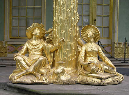 Sitzgruppe: Kaffee trinkende Chinesen (J.P. Benckert) Bei den Sitzgruppen ist, ebenso wie auf den Deckenmalereien im Innern zu beobachten, dass vor allem die Frauen durchaus europäische Gesichtszüge tragen