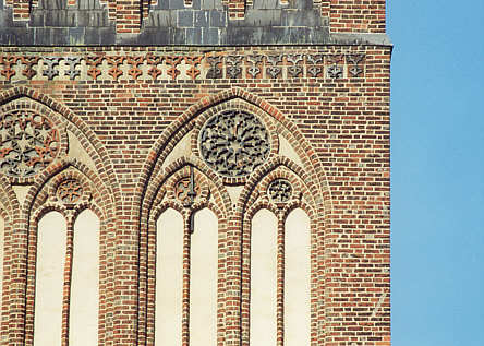 Wie in den Städten des Südens bestand der Zierrat aus Wimpergen und Rosetten, aus Simsen und Friesen - nur nicht aus Haustein, sondern aus in großen Mengen gefertigten Formsteinen.