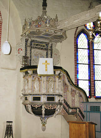 Kanzel (1618) Am Korb Evangelisten in halbrund geschlossenen Nischen, an der Rückwand eine Kreuzigungsszene