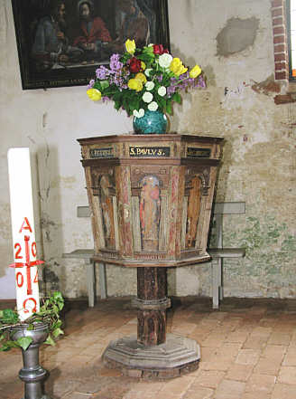 Tauf-Fünte, Holz, 1614 An den beschädigten Wandungen Evangelisten