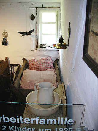 Schlafkammer der Familie. An der rechten Wand Kinderbett, davor Waschtisch.
