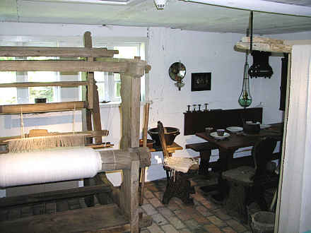Stube mit Tisch und Webstuhl für die Heimarbeit.