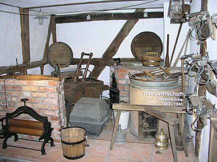 Vorne links eine Mangel zum Auswringen der Wäsche.