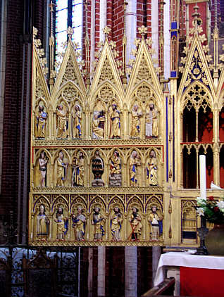 ehem. Hauptaltar im Chor linker Retabelflügel. Oben Szenen des Neuen Testaments, unten ihnen zugeordnet des Alten Testaments, darunter die 1360/65 ergänzrte Reihe von Heiligenfiguren.