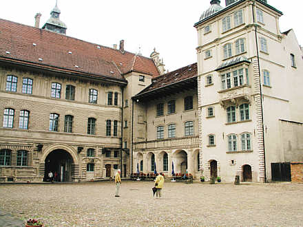 Schlosshof nach Westen. Rechts der Nordflügel, links der Westflügel mit dem Tordurchgang.