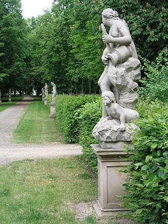 Götterallee aus 9 erhaltenen Sandsteinfiguren des 18. Jahrhunderts (Kopien) 1764 von J.G. Marckwalter aus Dresden für die Freitreppe hinter dem Schloss gefertigt. 1861 durch A. Wolff an den heutigenOrt versetzt, 1965-78 restauriert.
