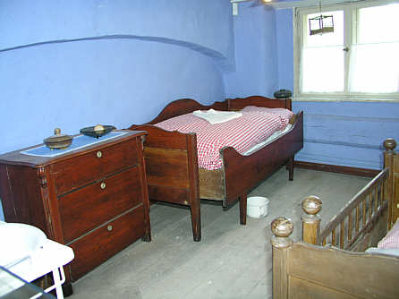 Schlafkammer mit Ausziehbett, Kinderbett, Kommode und Waschtisch