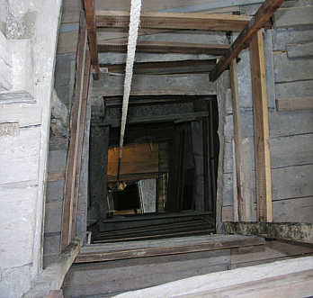 Schacht des Ladeaufzugs, der über alle Stockwerke bis unter den First reicht. Ihm entspricht in anderen Regionen die Ladeluke an der Front des Hauses