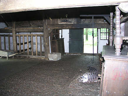Flett des Heuerhauses mit der offenen Herdstelle, dem Kran für den Kochtopf und dem seitlichen Ausgang gegenüber der Lucht, dem eingezogenen Essplatz. Der ältere Teil des Hauses enthält noch keine zusätzliche Arbeitskammer.