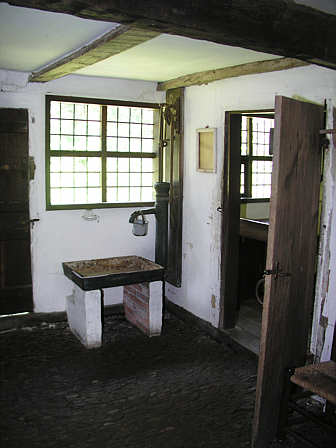 Waschort mit Punpe und Wasserstein neben dem seitlichen Ausgang. Rechts die Tür zur Stube.