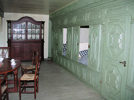 Dreiteiliger Alkoven mit jeweils mehrschläfrigen Betten. Die Alkovenwand mit den Türen ist mit barocken Spitzkissen verziert.
