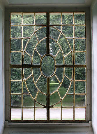 Die Risalite sind gegenüber den Achsen der Gesamtanlage gedreht, so dass der Blick aus den Fenstern nicht die Pavillons trifft, sondern in den Park geht.