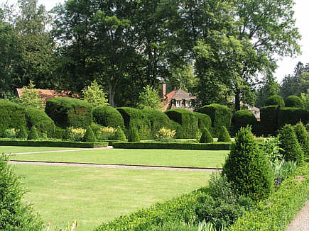 Garten im holländischen Stil mit hohen, in barocke Formen geschnittenen Taxushecken.