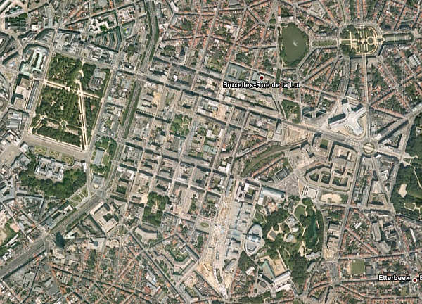 Das Satellitenbild zeigt das Quartier Leopold zwischen der Ringstraße mit dem Königspalast (links) und den Gebäuden der Europäischen Union (Europäisches Parlament, Mitte unten, und Rat der Union, Mitte rechts). Das Feld vor dem Europäischen Parlament befindet sich gerade im Bau (inzwischen fertiggestellt). Die Place Luxembourg liegt zentral vor den Parlamentsgebäuden.