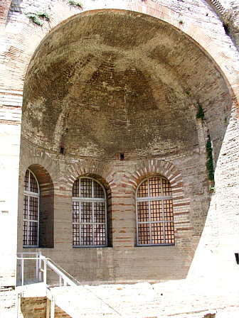 Apsiskalotte (halbkugelförmige Wölbung), mit drei Fenstern, hinterer Abschluss des Caldariums mit eigenem Warmwasserbecken.