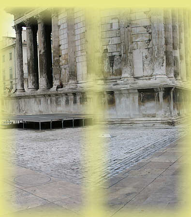 Im Umfeld des Maison Carrée sind Spuren des Forums markiert, hier der westliche Säulenportikus (links) und die durch Pilaster gegliederte Rückwand (rechts).