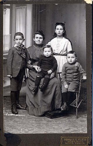 1915 Großmutter mit ihren Kindern: Emil (links), Willi (auf ihrem Schoß), Emilie (stehend) und Erwin (rechts). Das Bild wurde vermutlich als Erinnerung für den im Krieg befindlichen Großvater aufgenommen. |