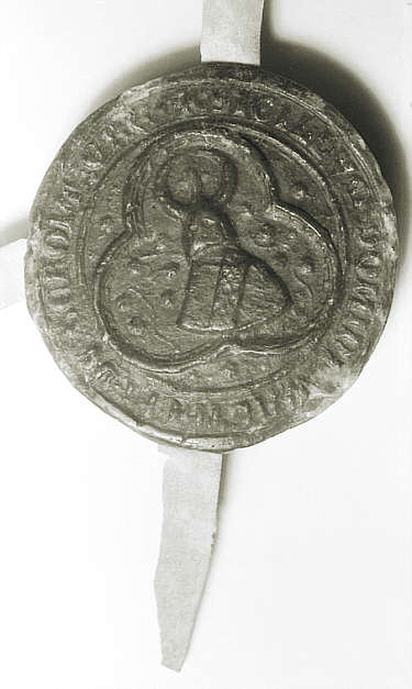 Typ III RS Ø 50 mm. SF: auf Rankengrund nach oben ger. Dreipaß; 3 erhabene Punkte außen, 10 innen. Darin nach rechts gelehnter got. Schild, darauf (links oben) geschlossener Helm, HS Büffelhörner und Mittelspange. WF: auf glattem Grund gegitterter QB. U: + SIGILLUM.DOM-INI. WALTHERI. DE. GEROLT Z EKE.